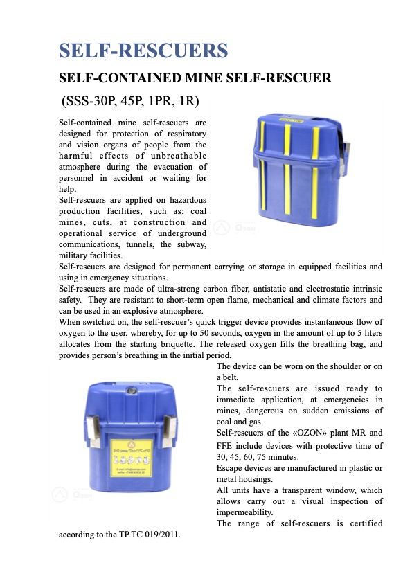 MYRESAN provides JSC Plant “OZON” mine-rescue and fire-fighting equipment (JSC Plant “OZON” MR and FFE) was found in 2004 on the basis of an experimental factory of mine-rescue equipment “OZON” in Gai Orenburg region. Since the establishment of the plant JSC “OZON” became a part of the group of companies “Glukauf”, which in 1994 was the leader in wholesale of mine-rescue and fire-technical equipment in Russia and far abroad. In 2004 JSC Plant “OZON” MR and FFE manufactured special devices for checking of panoramic masks and pressure oxygen cylinders, DG (disk sealing)(ДГ) and PC (control device)(ПК) and organized the production volume meter ( ИО). In 2005 JSC Plant “OZON” MR and FFE started manufacturing of self-contained regenerative respirator P-30M with the time of protective action – 4 hours, which were in great demand among rescuers. Later R-30M became available in lite version with metal-composite cylinder. In 2005, we have produced self-rescuers SSS-1M – reliable personal protection for mining workers. The issue of self-rescuers SSS-1M have reached 3,500 units per month. It was the first type of self-rescuers, which were staffed with goggles. In 2005, the Company received approval and certificate of compliance for the release of various types of fire- extinguishers.In 2005 JSC Plant “OZON” MR and FFE issued the first bellows suction AC-1. In 2005 JSC Plant “OZON” MR and FFE became a founding member and has been a full member of the All-Russia Association “Rescuers.” In 2006 JSC Plant “OZON” MR and FFE has entered the international market and began selling its products in South America and the Middle East. In 2010, on the basis of early produced by JSC “OZON” respirator P-30M, the plant specialists have developed a line of new models of upgraded respirators P-30P, P-30K and P-34P, P-30K and masks. In 2011, instead of the self-rescuer SSS-1M discharged early, JSC Plant “OZON” MR and FFE has developed a new generation of self-rescuers, with a superior technical characteristics, reduced weight and dimensions. Through the application of new construction materials, new manufacturing technologies and improved regenerative properties of the substance, downsized self-rescuer, and the time the protective effect has increased. In 2011, JSC Plant “OZON” MR and FFE started production in the Moscow region of the mine-rescue, fire and medical equipment. The company team is represented by experienced staff who have experience in the design and manufacture of modern mine rescue, fire-technical and medical equipment. The Company employs specialists with experience in the coal mines in the Ministry of Emergency Situations, Ministry of Defense, in medicine. Many of them have academic degrees of doctors and candidates of sciences. In 2011, the plant specialists have developed a high-frequency induction machine of mine connection “Quartz-3M” and the command center communication device “Quartz-KP-M.” We have developed and put into production underground unit of wire communications “Ugolyok- 2M”. Mine Rescue Reel KSG-R was developed and tested, especially for underground wire communication apparatus “Ugolyok- 2M”. KSG-R has a lower weight and improved sound conduction, than similar coil connectors. In 2012, JSC Plant “OZON” MR and FFE released an experimental batch of new respirators and self-rescuers.