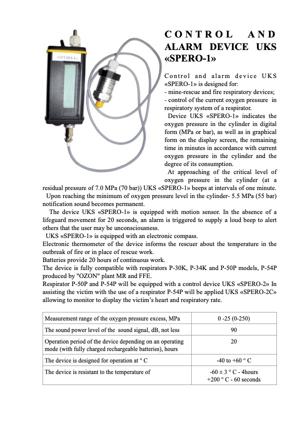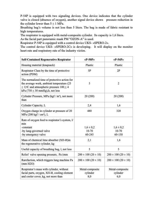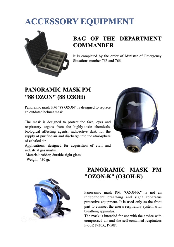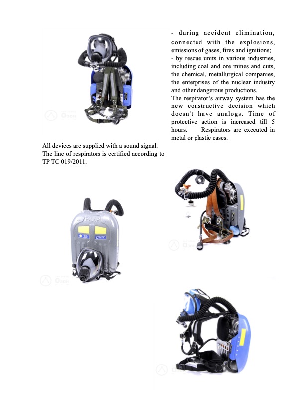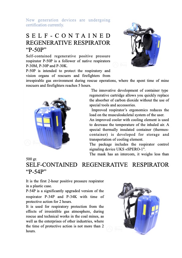 In early 2013 the plant “OZON” MR and FFE has begun to develop a new generation of respirators P-50P and P-54P and self-rescuers SSS-30, SSS-45, SSS-60 and SSS-120 minutes with improved characteristics. The developed devices meet current physiological requirements, designed to protect the respiratory system of people from the harmful effects of unbreathable gas atmosphere during the rescue work in ore and coal mines and quarries, as well as to equip the rescue and fire units, using innovative technologies. The airway system of respirators has a new design solution. Protective action time is increased to 5 hours. In 2013, for respirators P-30K, P-34K and P-50P, P-54P was developed an electronic control and signaling device «SPERO-1», designed to monitor the parameters of breathing apparatus and the environment, as well as alert the user and others of critical situations approach. For carrying and storing of cooling element a special container thermos was developed. In 2013 to verify the integrity of all types of self-rescuers the device UPGS-R was created. In November 2013 respirator P-30K was upgraded to a respirator P-30KM with a new plastic cartridge with a plastic cooler performance and connection box, which could be used in two ways for tipping the box and panoramic mask PM “OZON-K.” Junction box was made of plastic. In 2014, production of aspirators bellows AC-1 was resumed.